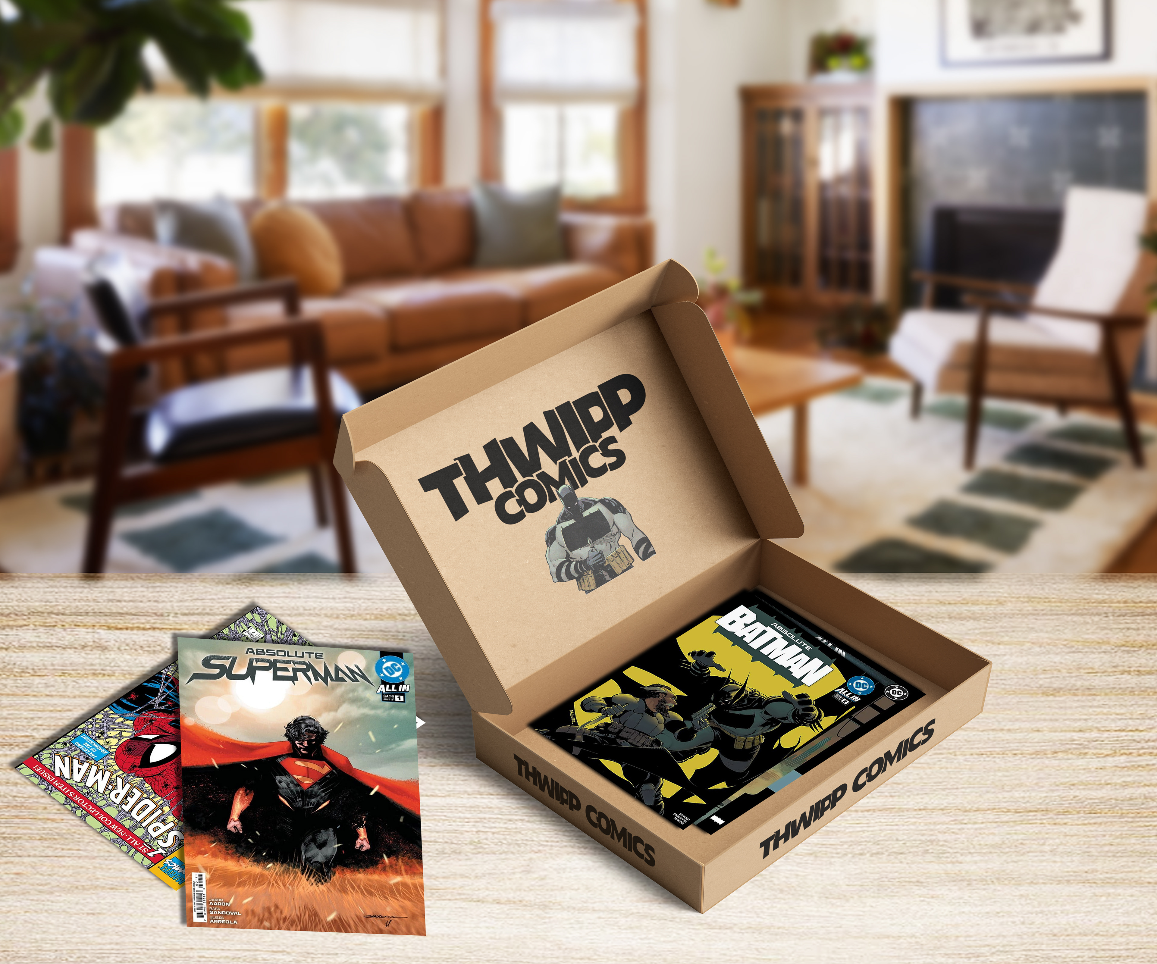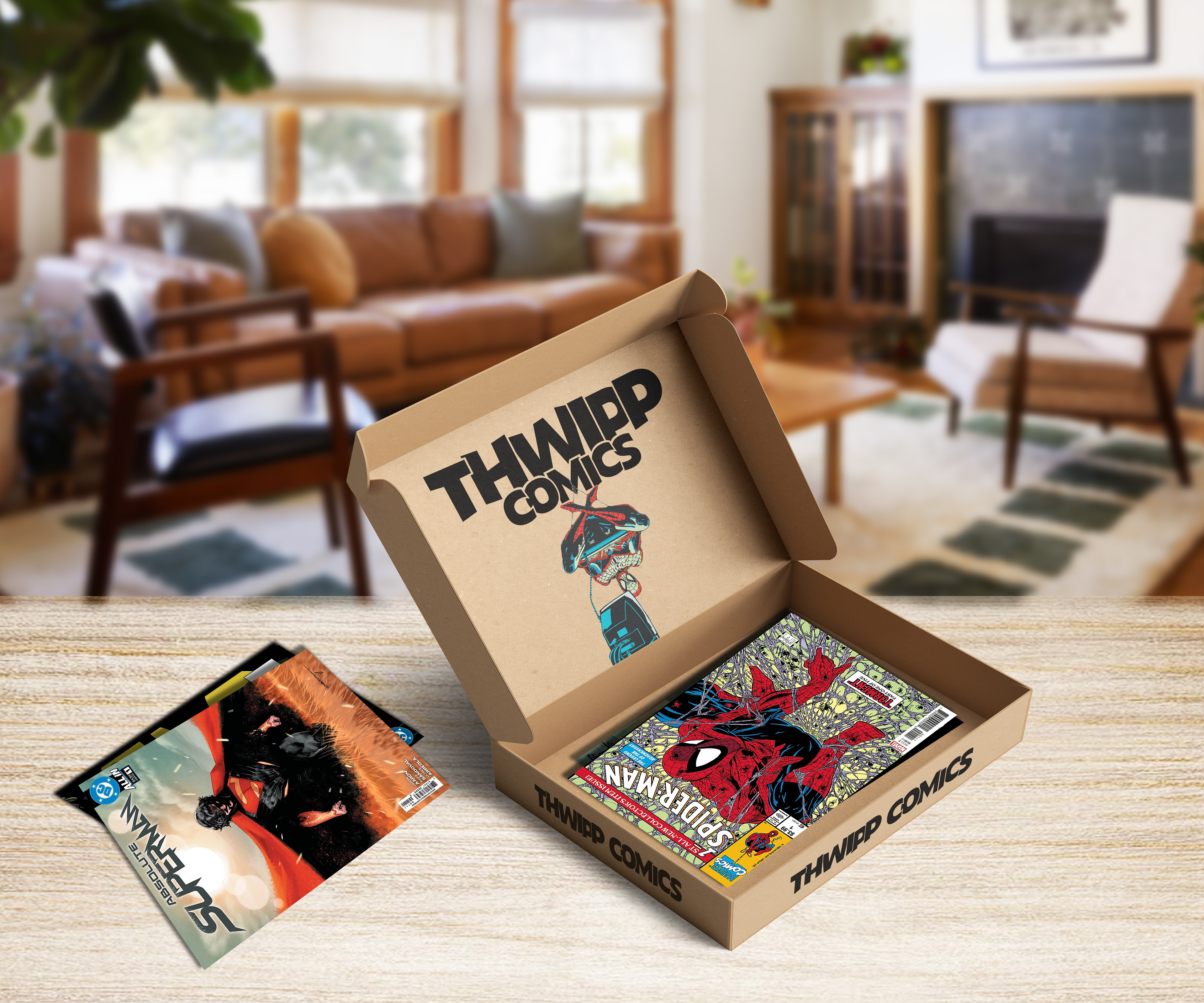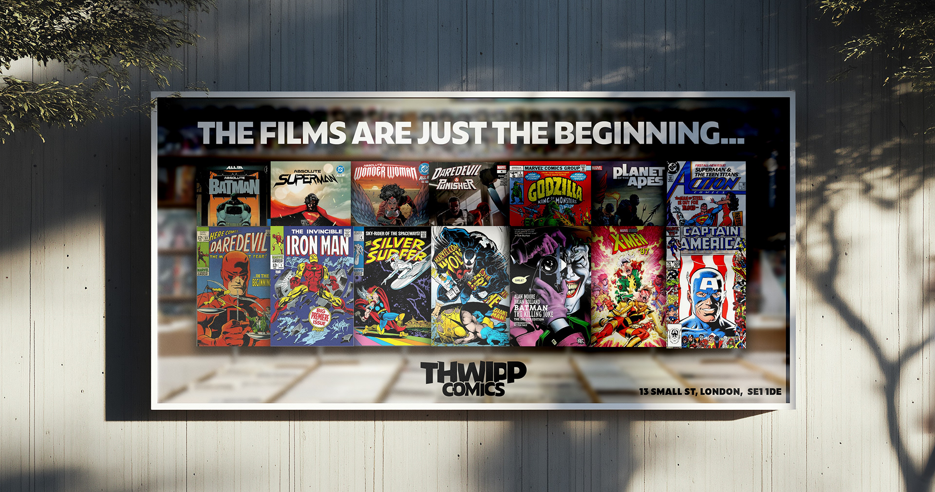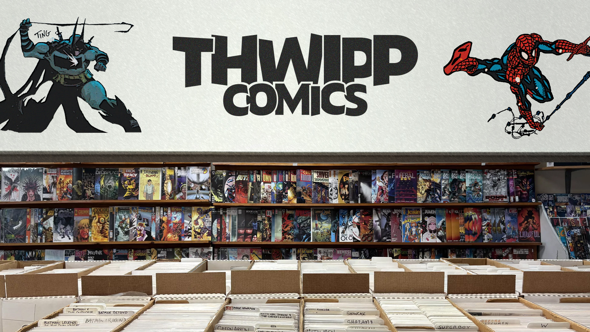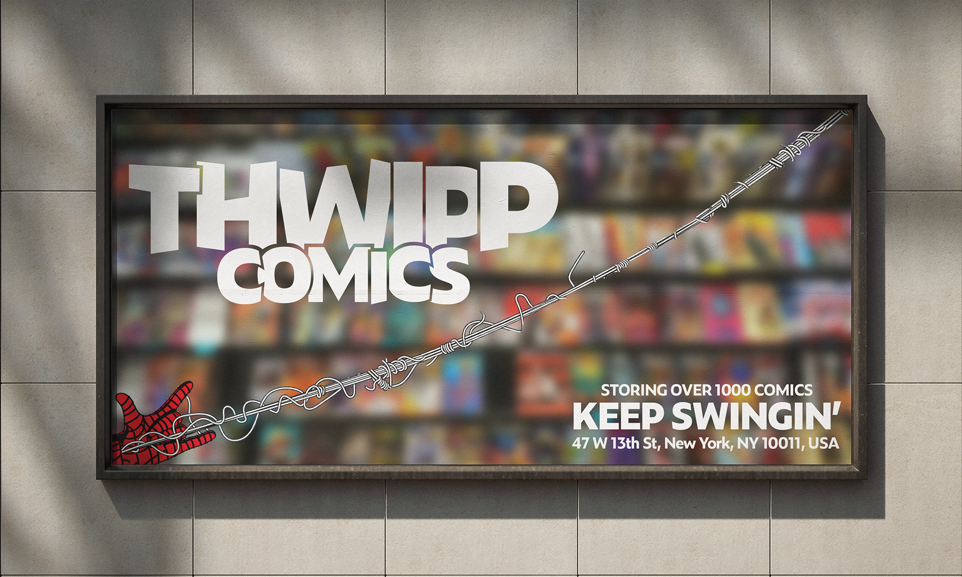 Comic book stores are notorious for having an unapproachable, dated, low budget looking visual identity. Less than 10% of superhero movie lovers actually purchase comic books, so introducing Thwipp Comics. A modern take on the classic comic book store branding that attracts more than just the comic book lovers and to help push movie fans towards the physical media route.